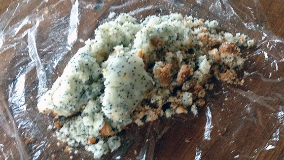 I then reached into the other side and found something else that felt like my new mitts. Confused, I pulled out the contents of both pockets. The second pocket had held the mitts. The first one had held a plastic-wrapped piece of gluten-free poppy seed loaf—a piece of poppy seed loaf that was much worse for wear than it had been before I squeezed it. This was what I got when I unwrapped it.