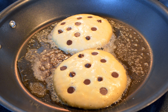 The original recipe calls for blueberries, but we didn’t have any of those, so we were of course forced to use chocolate chips. The flavours went together beautifully.
