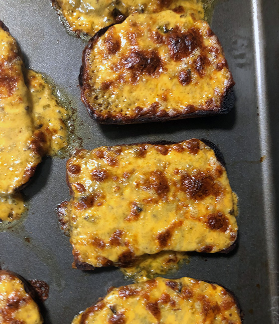 It works on any kind or sized of bread. If you are using sliced bread, you can toast it first. (It was also amazing on fresh rolls—no toasting required!) My parents used to toast sliced bread in batches under the broiler element on one side, and then add the cheese topping to the other side and return back to the oven to get them all brown and toasty.