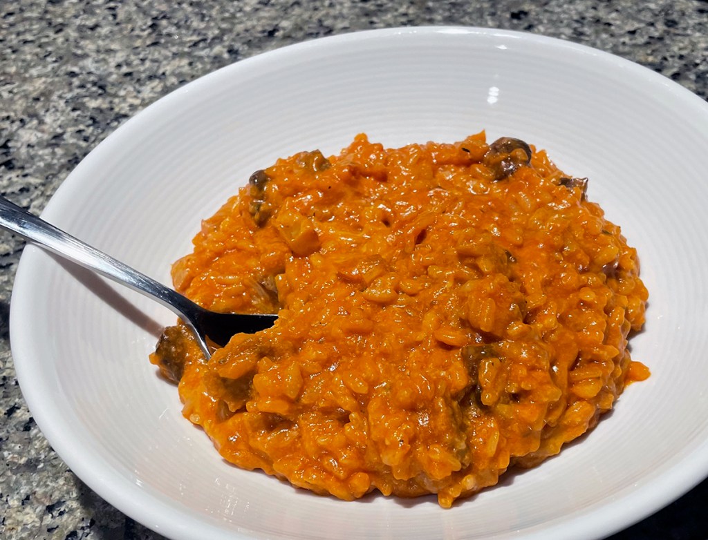 This tomato risotto, my sister’s creation, hit the spot. It features Italian sausage and roasted vegetables—mushrooms and yellow sweet peppers. For cheeses, we used a mild but melty cheese, smoked cheddar and pecorino.