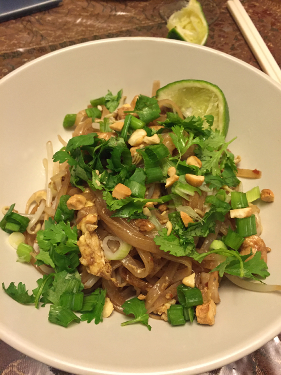 My niece and I whipped up this pad thai tonight. The perfect comfort food! We made it with shrimp and chicken. We added bean sprouts and garnished it with cilantro, green onions, lime wedges and chopped cashews. We used this great tutorial and, even though I normally have trouble actually doing what recipes tell me to do, this time I followed Pim’s advice and made sure that we drank champagne with our meal. ¡Que aproveche!